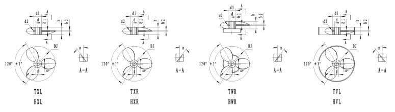 75、三葉左旋導流筒推進式TVL 76、三葉右旋推進式TXR