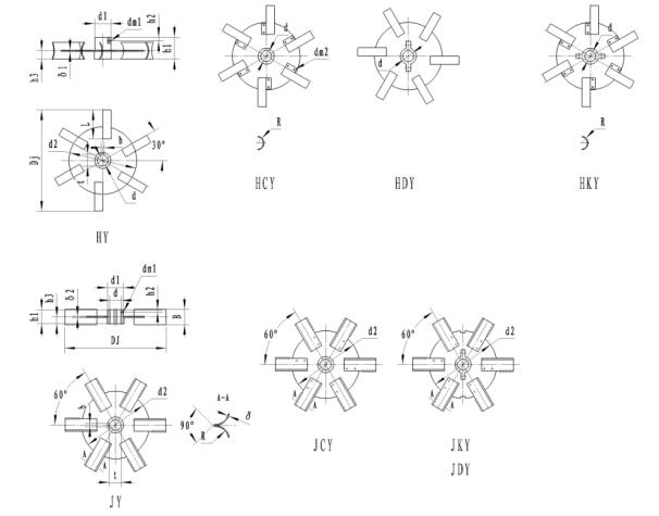 64、半圓弧對開圓盤渦輪式HDY 65、半圓弧可拆對開圓盤渦輪式HKY 66、箭葉圓盤渦輪式JY 67、箭葉可拆圓盤渦輪式JCY