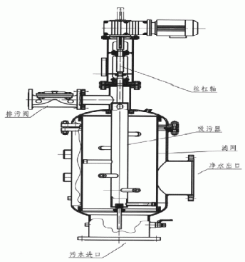 過濾過程:污水從過濾器進口進入,然后從里向外通過濾網(wǎng),比網(wǎng)孔大的雜質(zhì)被攔截下來并積累在濾網(wǎng)的內(nèi)表面形成濾餅,這些濾餅同時能夠捕捉水中的一些更細小的雜質(zhì)。自清洗過程:壓差開關(guān)持續(xù)地檢測濾網(wǎng)內(nèi)外的壓差,當達到預設(shè)值時將傳遞信號到控制箱啟動清洗循環(huán)。過濾器的清洗機構(gòu)是作螺旋式上下運動的吸污器,它是空心結(jié)構(gòu),在它的軸線上按一定距離垂直均勻分布著若干個吸污管。吸污器與一個排污閥相通。在排污閥打開時,過濾器內(nèi)部水壓與外部大氣之間形成的壓差使吸污管產(chǎn)生強勁吸力,水流從濾網(wǎng)外向內(nèi)反向高速流動將雜質(zhì)沖下來進入吸污器通過排污閥排出。吸污器由一個連有絲桿裝置的雙向電機驅(qū)動,按照固定的轉(zhuǎn)速作螺旋式的運動,這樣多個吸嘴就能吸遍整個濾網(wǎng)內(nèi)表面,這個過程大約需要半分鐘。在整個反清洗過程中,系統(tǒng)不斷流。過濾器的整個運行由程序控制器(PLC)來控制完成。圖1 為北京化工大學與唐山陸凱科技有限公司共同研制的吸污式自清洗過濾器結(jié)構(gòu)示意圖。