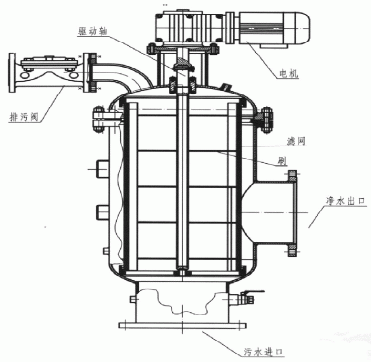 刷式自清洗過濾器為一種適用于惡劣環(huán)境的自清洗過濾器,對于不同的使用要求可配備3500微米-200微米的濾網(wǎng)。過濾器的清洗過程由一個時刻監(jiān)測過濾網(wǎng)兩側(cè)壓差的壓差開關(guān)來啟動,通常情況下壓差開關(guān)的預設(shè)值是0.05Mpa。當過濾器濾網(wǎng)兩側(cè)壓差達到預設(shè)值時,過濾器將開始自清洗過程,整個自清洗過程包含兩個步驟:打開位于過濾器端蓋上的排污閥;電機帶動濾網(wǎng)內(nèi)的不銹鋼刷轉(zhuǎn)動,被濾網(wǎng)所捕捉的雜質(zhì)被鋼刷刷下并從排污閥排出。整個清洗過程耗時 約20秒,清洗時系統(tǒng)不斷流,過濾器 的整個運行過程由隨機配備的一個控制箱來控制。圖2為北京化工大學與唐山陸凱科技有限公司共同研制的刷式自清洗過濾器結(jié)構(gòu)示意圖。