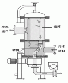 轉(zhuǎn)臂式自清洗過濾器是一種集約化的過濾器,多個濾筒安裝于一個過濾器筒體內(nèi),結(jié)構(gòu)緊湊。轉(zhuǎn)臂式自清洗過濾器用于去除低粘度介質(zhì)中的固體顆粒。需過濾的介質(zhì)從內(nèi)向外流過過濾器的楔形網(wǎng)濾筒,固體顆粒截留在濾筒內(nèi)側(cè)。隨著污染物的增多,過濾器污染側(cè)和清潔側(cè)之間的壓差增大。若壓差達到設(shè)置的觸發(fā)壓差便開始自動反沖洗。反沖洗時.齒輪電動機轉(zhuǎn)動欲清洗濾筒下面的沖洗臂,進入反沖洗狀態(tài)的濾筒的原料液流被中斷。反沖洗閥開啟,濾液側(cè)和反沖洗管路之間的壓降把一小部分濾液逆向沖入欲清洗的濾筒。聚積在濾筒內(nèi)側(cè)的污染顆粒物被松開并通過沖洗臂沖進反沖洗管路。每個濾筒的反沖洗時間一過,反沖洗閥立即關(guān)閉。這樣所有濾筒被依次清洗。所有濾筒都被清洗后,反沖洗循環(huán)結(jié)束。轉(zhuǎn)臂式自清洗過濾器可以用來除去工業(yè)用水和海水中的固體雜質(zhì)。轉(zhuǎn)臂式自清洗過濾器常用于保護重要設(shè)備,如冷卻系統(tǒng)、化學和水處理裝置等。圖3為轉(zhuǎn)臂式自清洗過濾器結(jié)構(gòu)示意圖。